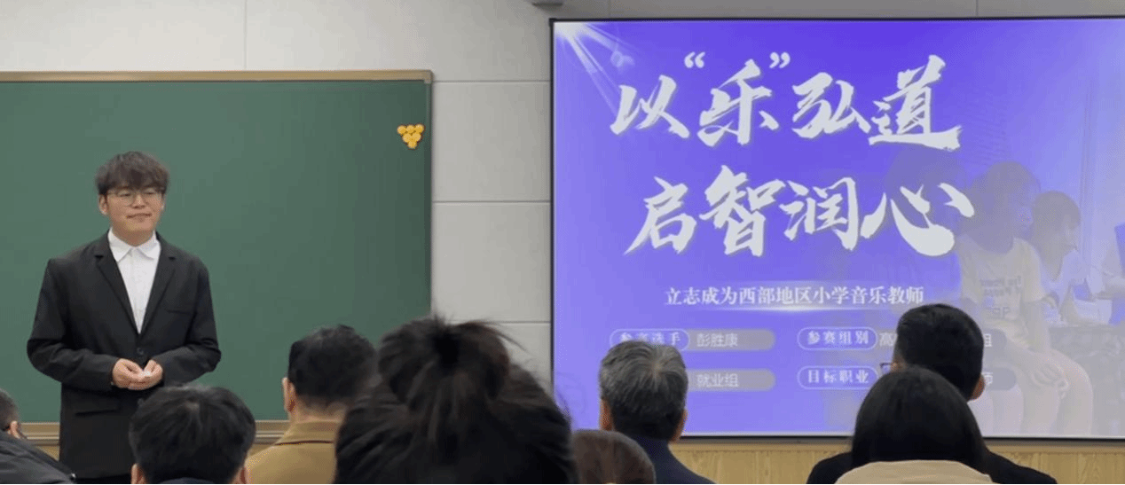 第二届湖南省老员工职业规划大赛省级决赛现场赛于2025 年1月10-12日在中南林业科技大学进行,我院音乐教育专业2024级研究生彭胜康,在其导师陈瑾的指导下,以“成为西部地区小学音乐教师”为职业目标,凭借详尽的职业规划和出色的展示,荣获大赛三等奖。