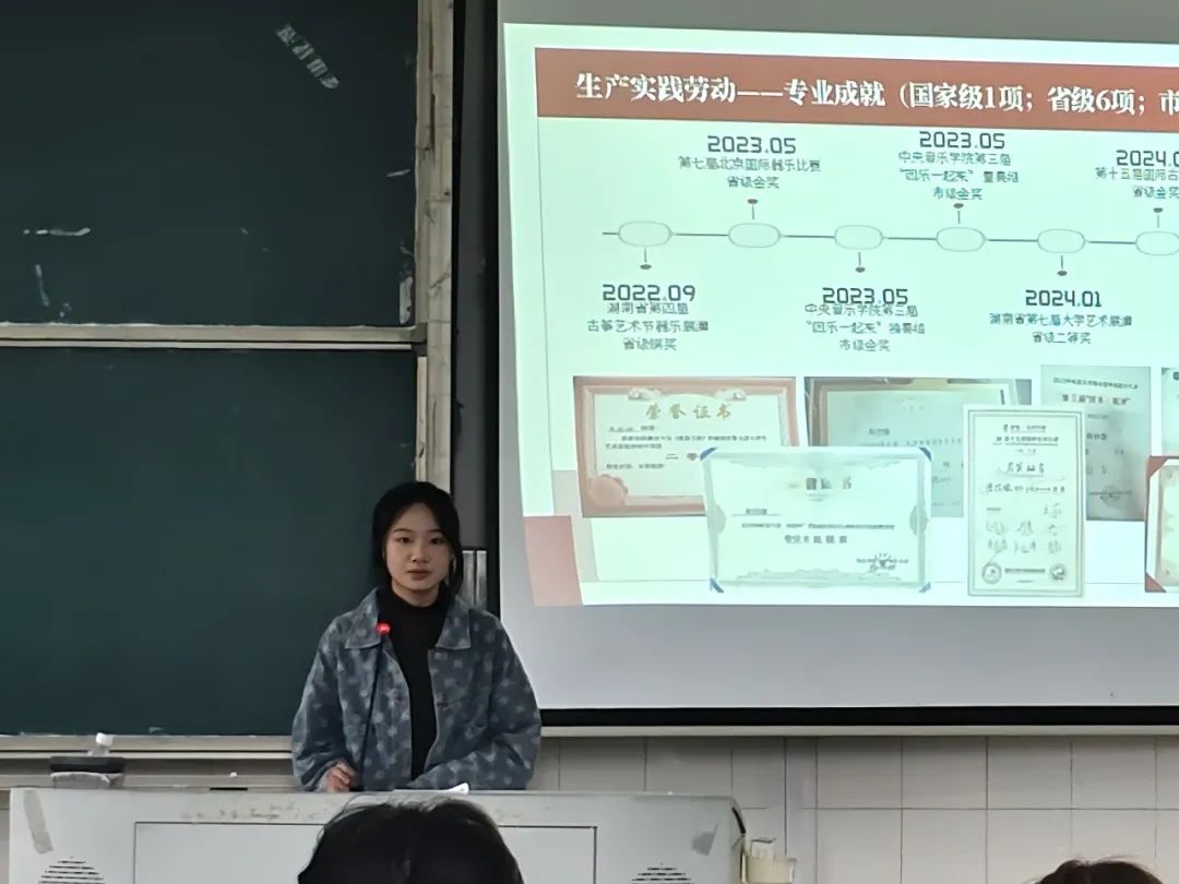 陈怡璇,2021级音乐学六班员工,曾担任公海gh555000aa线路检测团委员工会宣传部部长。她聚焦于生产实践劳动,3月19日中午13点,在音乐楼教室301,她向同学们分享了她主专业方面的心得。她曾获国家级奖项1项、省级6项、市级3项、院级两项。要寻求主专业的突破,应勤学苦练并在丰富自身专业能力的基础上,不断寻求实践平台,抓住一切可以锻炼的机会,努力展现自我。