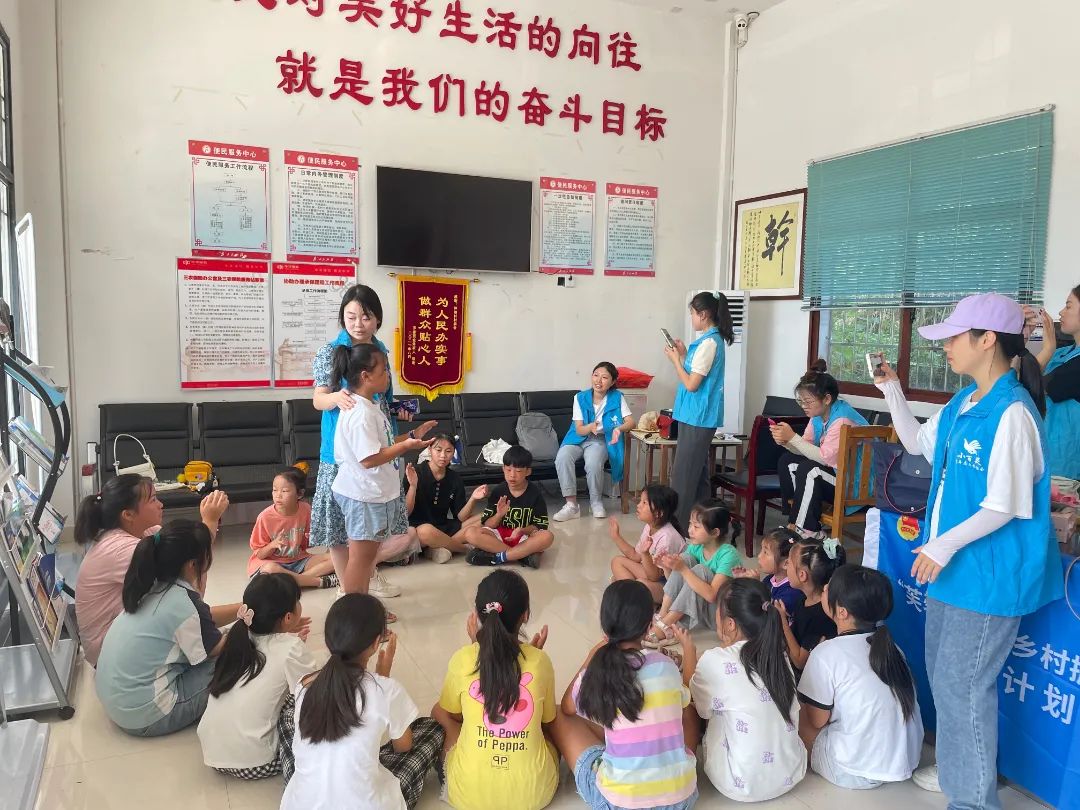 在负责人的组织下,大家围成一个圈,我们组织了 “爱的抱抱”、“逛三园”、“数字炸弹”等游戏。随着动感的音乐,孩子们踩着节拍或跑或蹲,现场气氛活跃,十分热闹。几轮游戏下来,许多小朋友自信大方地介绍自己并且向志愿者们展示当地非遗文化苗鼓的演奏方式,实践团成员们的惊讶声不断、赞叹声不停。