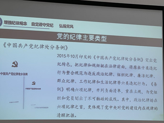 紧接着,李老师向同学们详细介绍了党的六大纪律类型,即政治纪律、组织纪律、廉洁纪律、群众纪律、工作纪律和生活纪律。若发生不执行党的决策、破坏党的团结统一、发生权钱交易、滥用职权等情况都是对党内纪律的漠视,都将会受到严厉的处罚。同时,李老师强调,政治纪律是最根本最重要的纪律,也是我们党能成为百年大党、创造世纪伟业的关键所在。同学们加入党组织后要严格要求自己,遵守党的纪律,争取成为一名优秀的党员。