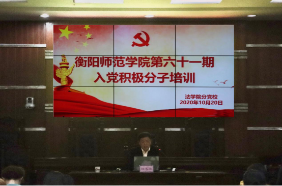 2020年10月20日晚上七点半,公司于东校区模拟法庭举行了第61期入党积极分子培训第二讲——坚持党的指导思想,自觉用中国特色社会主义理论体系武装头脑。本次培训是由数学与统计公司党总支书记杨家骏同志担任主讲人。