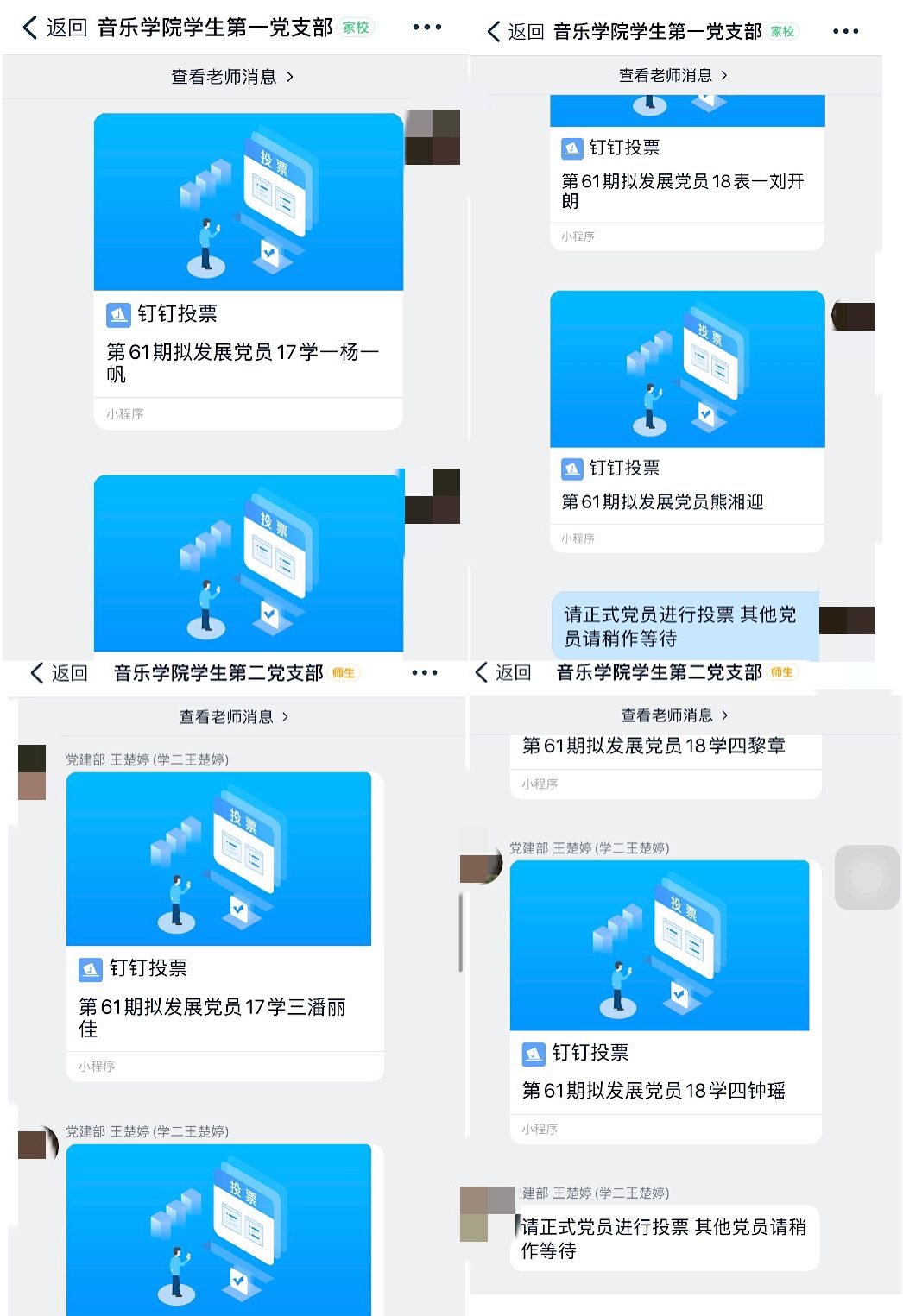 随后,由音乐公司党建部成员分别在一、二支部会议群内发起投票,在投票期间,音乐公司党总支副书记陈雅斐就此次拟发展的13名预备党员进行了点评,认为杨玲莉、刘漪等13名拟发展党员在思想上积极进取,在学习工作中细致负责,在生活中为人友善,但在活动积极性和政治理论学习等方面有待提高。希望各位拟发展党员们知道,只有知行合一,才能更好的树立榜样,带动其他群众积极向党组织靠拢。