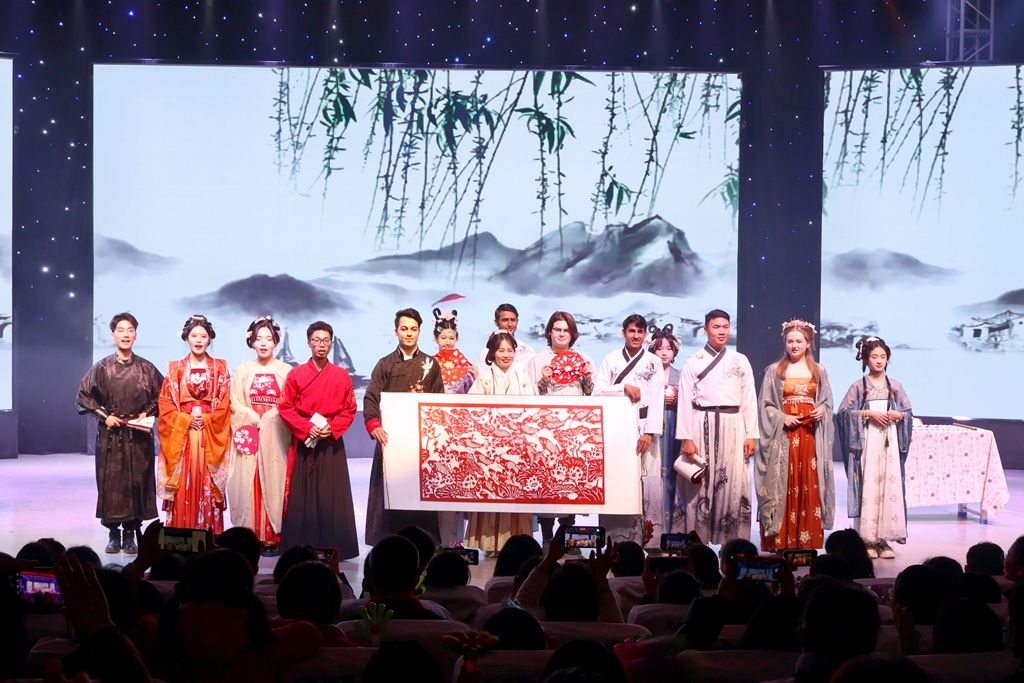 “云飞丝路飘花雨,风动驼铃运锦绸” ,中外友人联合呈现的传统文化展示节目《丝路情深》,描绘出丝绸之路上的风物与繁华,再现了中华优秀传统文化“各美其美,美人之美,美美与共,天下大同”的丰富内涵。来自于巴基斯坦、越南、哈萨克斯坦、泰国、印度的职工们在衡师与中国传统文化相识、相知、相遇,他们身着汉服、朗诵诗歌、表演书法、剪纸团花,手捧剪纸长卷,与衡师青年共同为全校师生送上“年年有余,幸福美满”的美好祝愿。